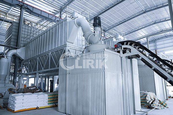 破碎后的小块膨润土经提升机送至料仓,再经振动给料机将其均匀定量的送入磨粉机研磨室内进行研磨。