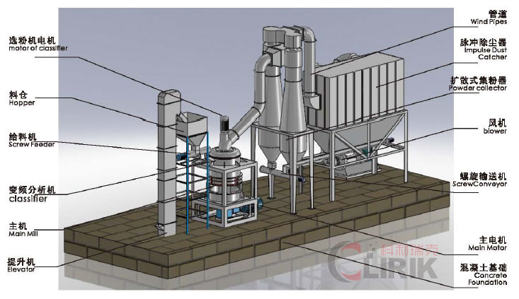 HGM超细磨粉机生产线包括破碎机、斗式提升机、储料仓、振动给料机、超细磨粉机主机、变频分级机、集粉器、脉冲除尘器、高压风机、空气压缩机、电气控制系统。